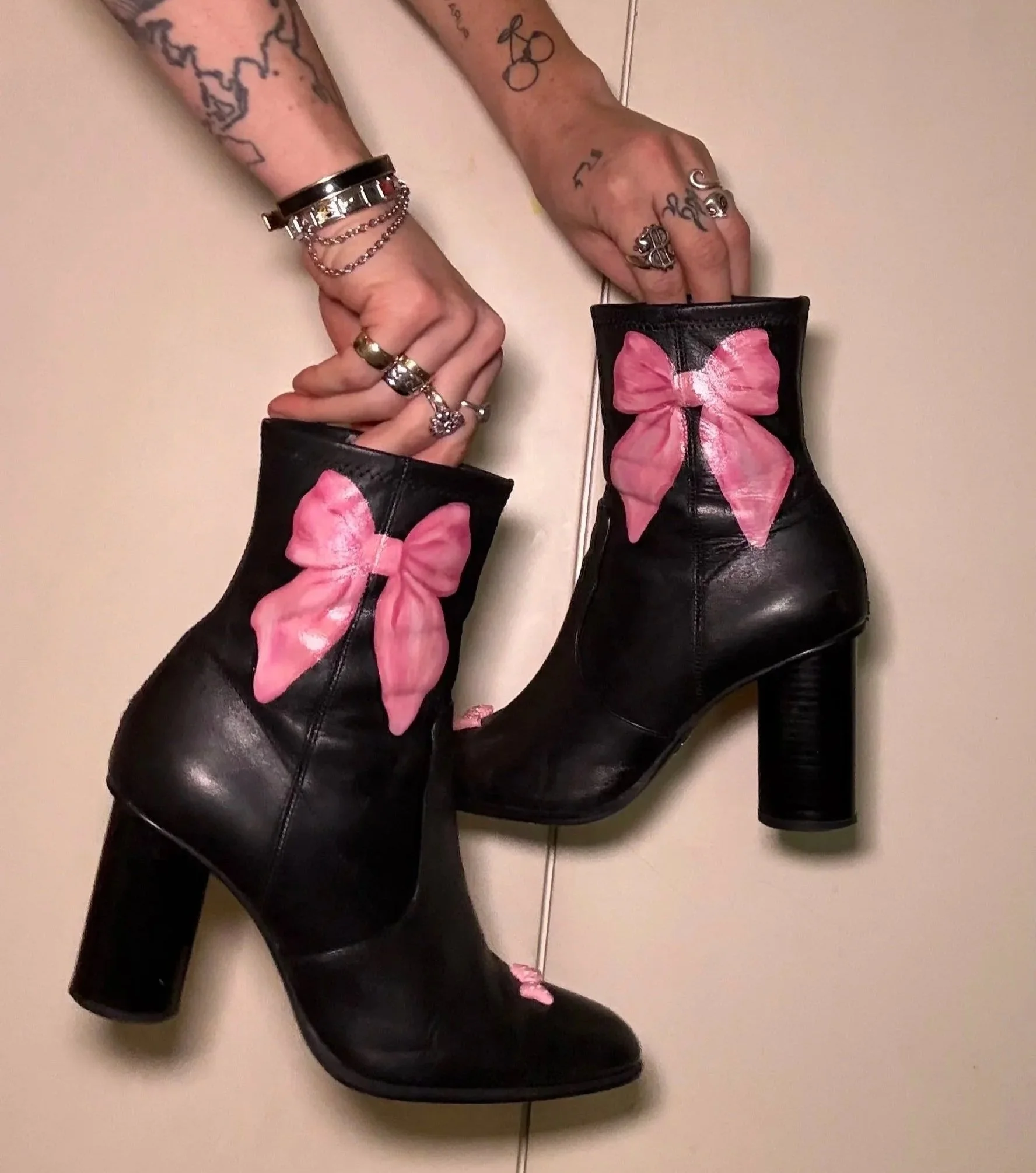 One of one hand-painted black genuine leather ankle boots. High quality leather paint + satin acrylic finish.